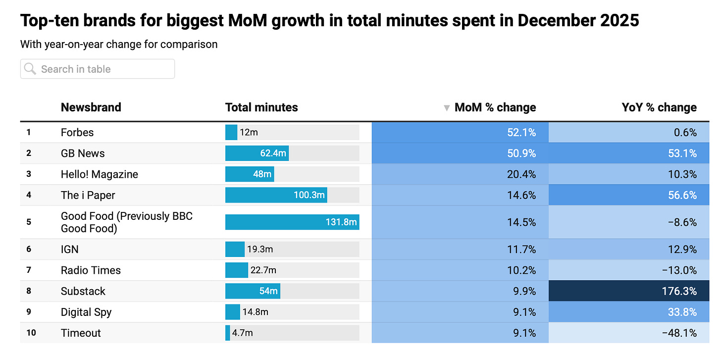 In other news, specifically GB News, Press Gazette have released another chart looking at the 50 biggest news sites in December. Perhaps, we shouldn’t really be surprised about the rise of Substack (I mean, everyone has one now, right?) but the performance of GB News has been nothing short of a digital success story - even though it pains me somewhat to admit it as a left-leaning poet personality type who wouldn’t have fared well in Stalin’s Russia.