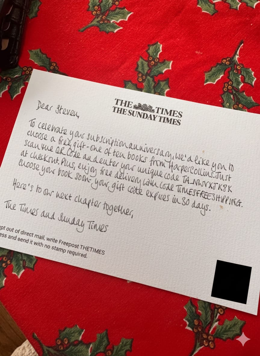 Personalised moments - surely we can do better than the birthday email from brands we thought we’d unsubscribed from years ago? Maybe something like this which I received from The Times in December offering me a free book as a thank you for my subscription loyalty (don’t worry, I’ve used the code).