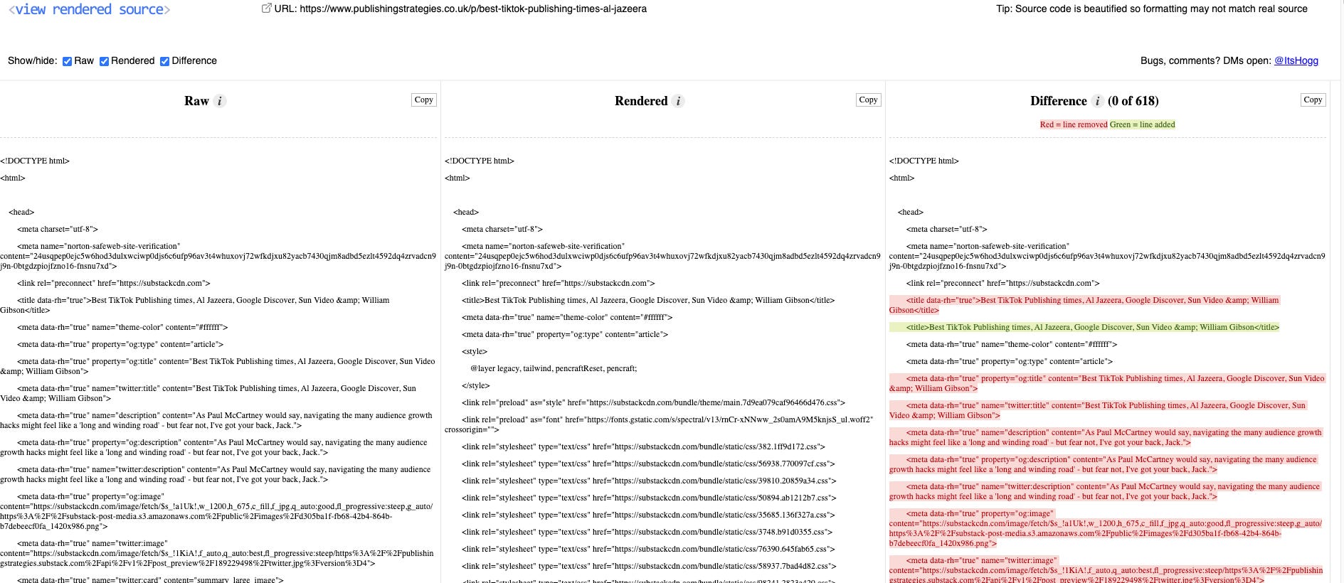 There are also many other tools that can help there including the View Rendered source extension or even Screaming Frog which is useful for projects at scale.
