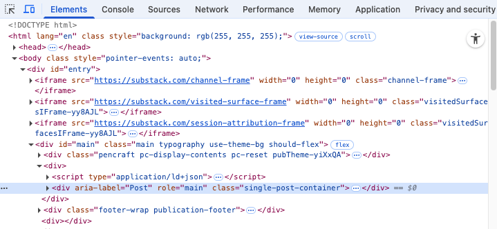For the uninitiated, the quickest way of viewing the DOM is by using browser developer tools like this version in Chrome. It might look scary at first but, trust me, these tools contain a goldmine of information about your pages.